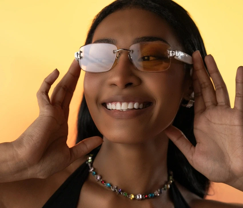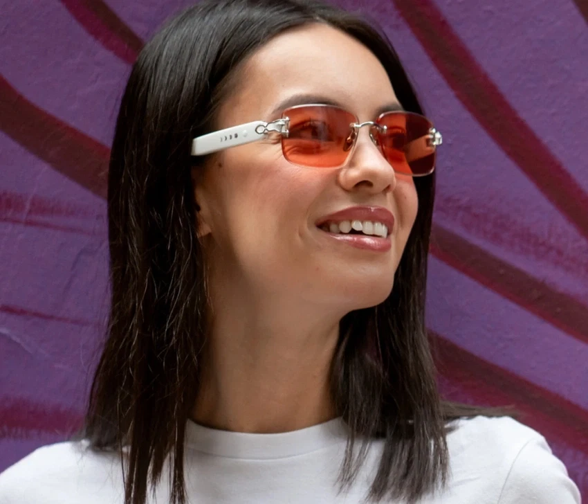 Head-turning rimless sunglasses with Prismatic™ Color-Changing Lenses—Four colors. One tap. Instant energy.